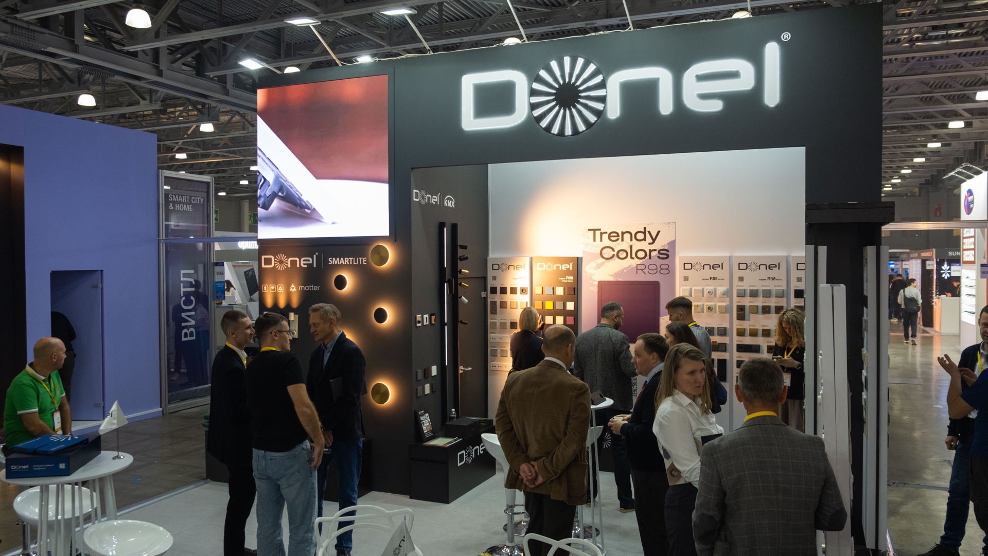 Бренд Donel стал одним из центральных экспонентов. Гости стенда смогли оценить новые серии электроустановочных изделий, современное трековое освещение, оборудование для организации рабочих мест и комплексные решения на базе стандарта KNX для проектов любой сложности. Особый интерес у архитекторов, дизайнеров, и проектировщиков вызвали решения, впервые показанные на выставке: серия D16, яркие розетки и выключатели R98 Trendy Colors, тумблерные выключатели N96 и новый цвет в серии R98 – «Матовый Жасмин».