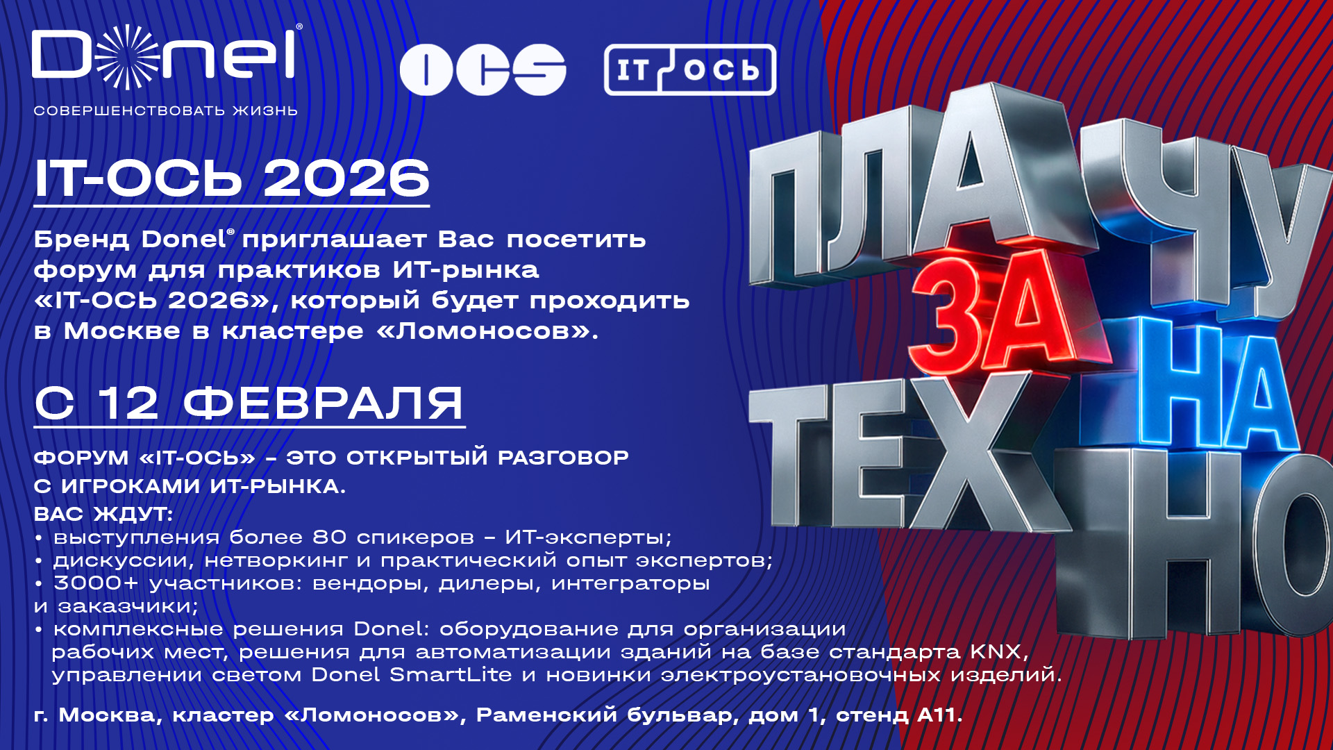 Бренд Donel приглашает Вас посетить форум для практиков ИТ-рынка «IT-ОСЬ 2026», который будет проходить 12 февраля в Москве в кластере «Ломоносов», по адресу: Раменский бульвар, дом 1.