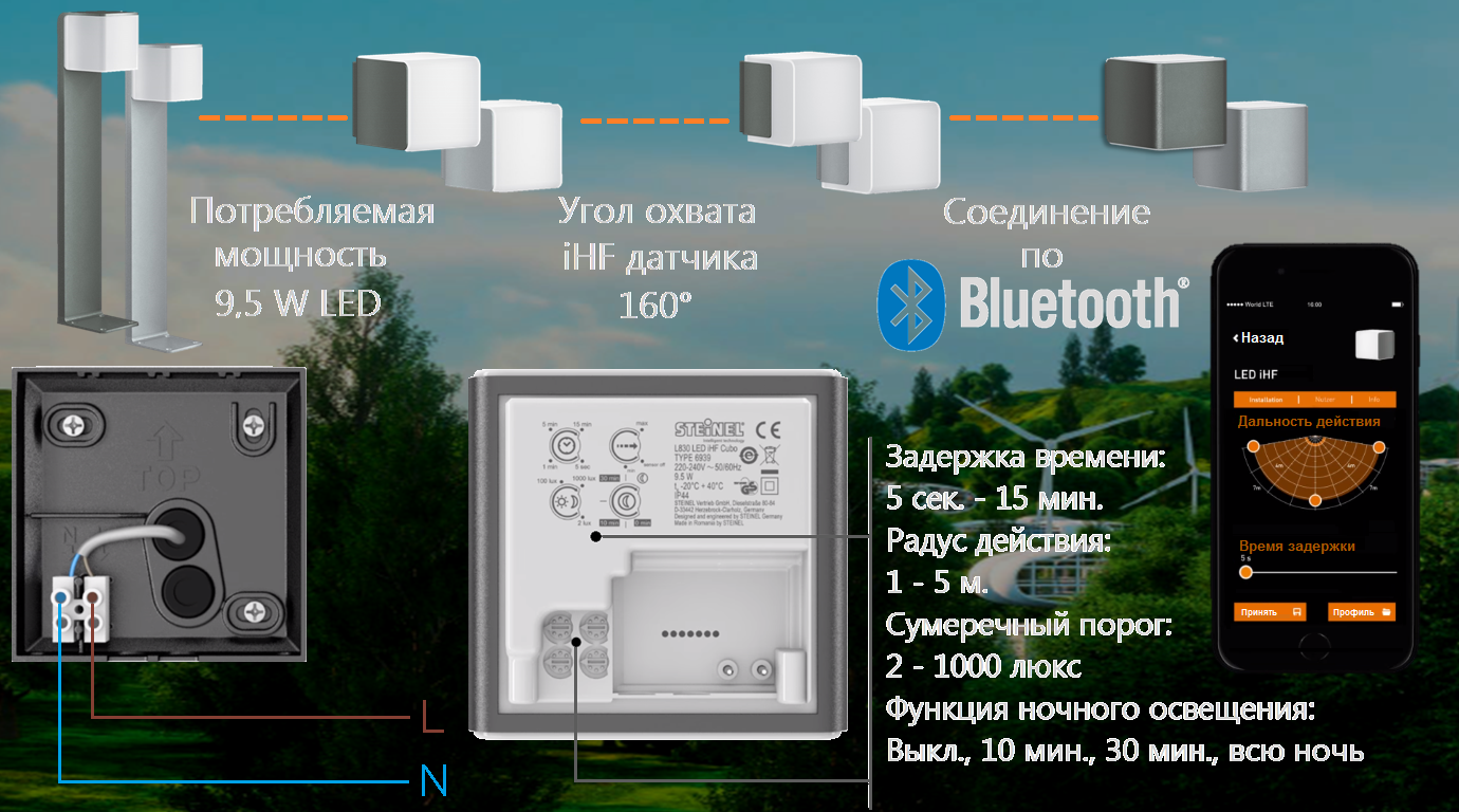 механическая регулировка дальности действия с точностью до метра с помощью поворотного регулятора на светильнике или с помощью приложения Smart Remote (в 3-х различных направлениях, независимо друг от друга – только с помощью приложения Smart Remote)