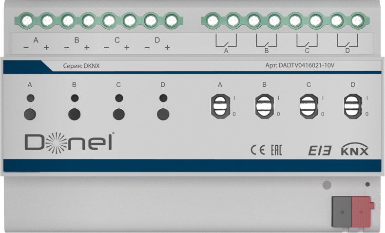 Donel KNX Диммер 1-10V , 4-канальный, 16A Пассивный режим DC 0/1-10 В, ток переключения 16 А / 250 В