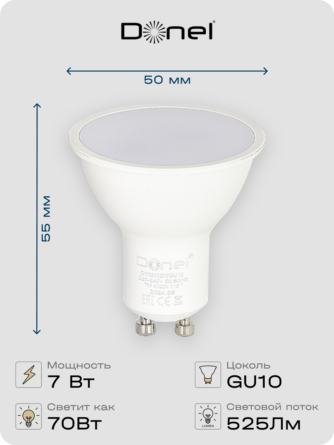 Donel, Светодиодная лампа 7Вт, MR16, 220В, GU10, 3000K, 525Лм, Ra>80, 110°, D50хH55мм, Серия: DN03