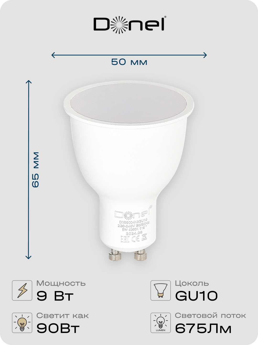 Светодиодная лампа 9Вт, MR16, 220В, GU10, 4000K, 675Лм, Ra>80, 110°, D50хH65мм
