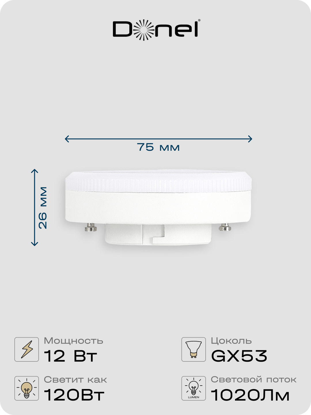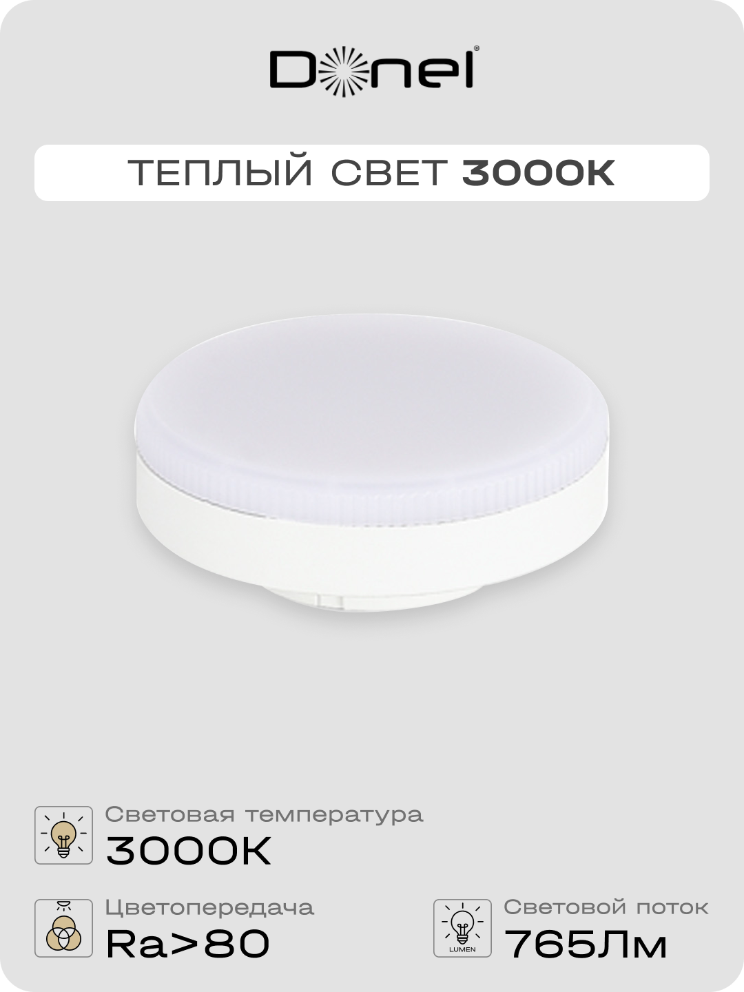 Светодиодная лампа 9Вт, 220В, GX53, 3000K, 765Лм, Ra>80, 110°, D75хH26мм, Dim Triac
