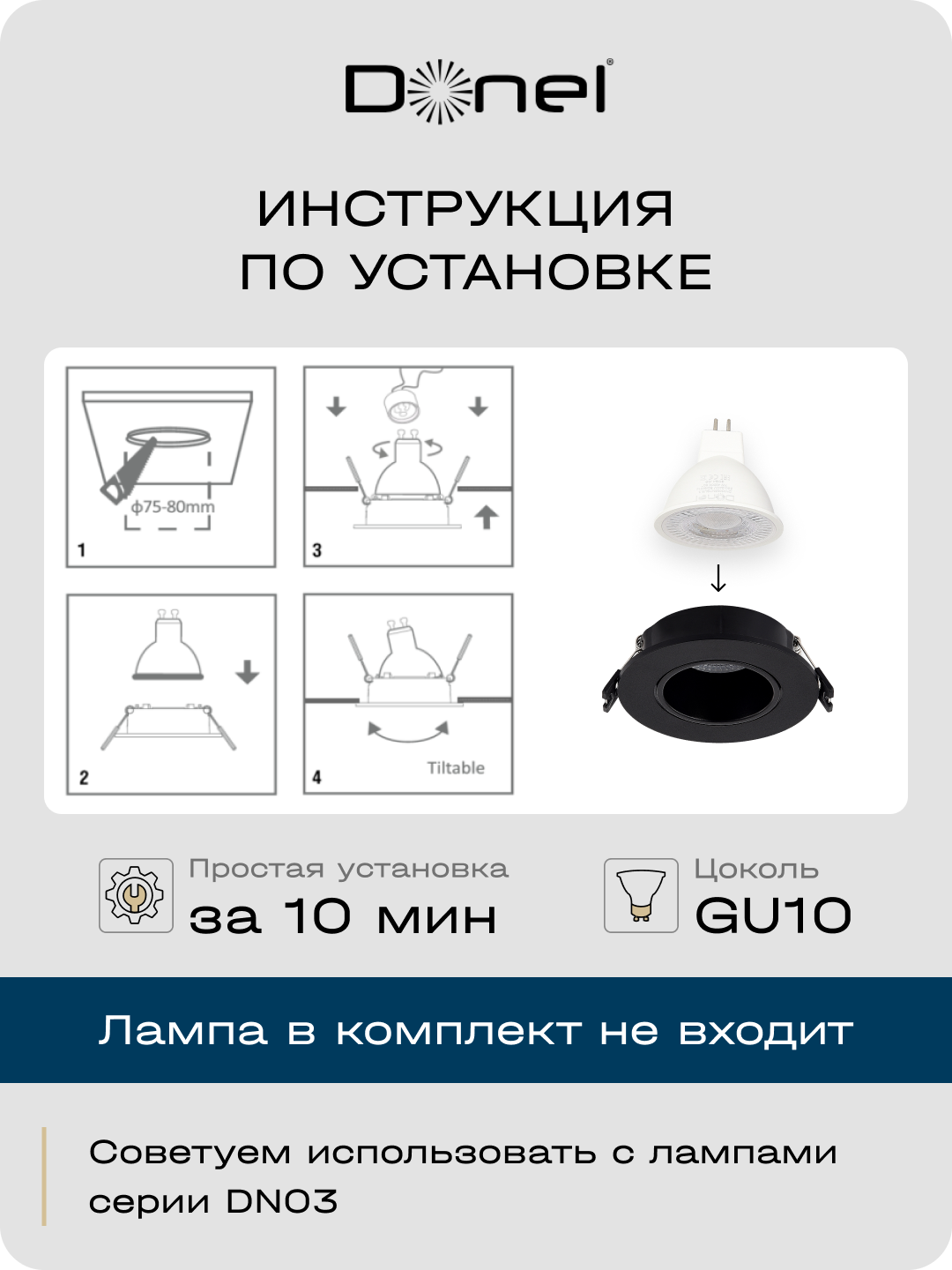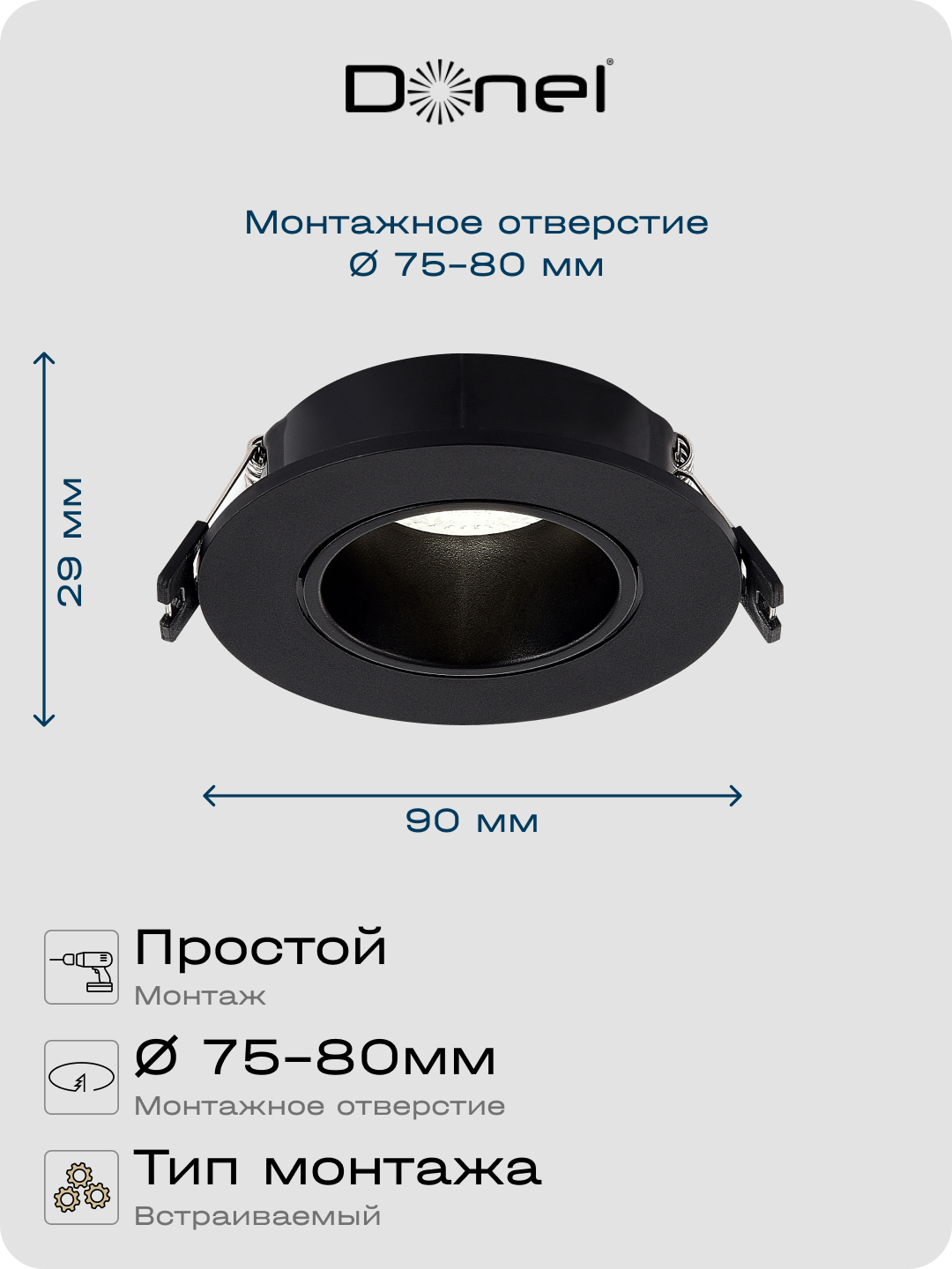 Donel, св-к встроенный, цвет ЧЕРНЫЙ, D90xH29мм, под лампу GU10, материал РС, IP20, серия: DN04