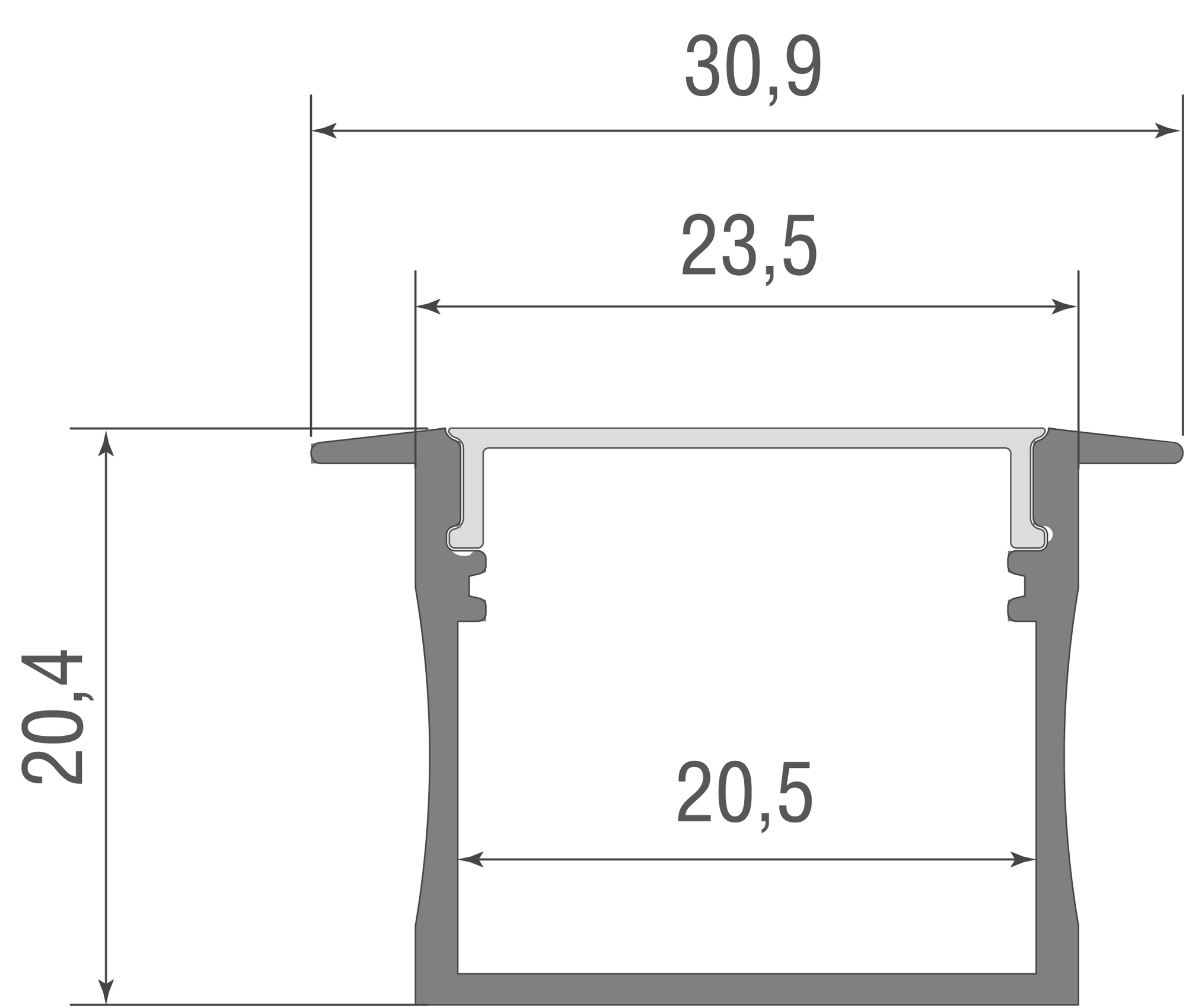 Встраиваемый алюминиевый анод. профиль, 30х20,5х2000мм. В комплекте матовый экран, 4 торцевые заглушки, 4 крепежа, алюминий