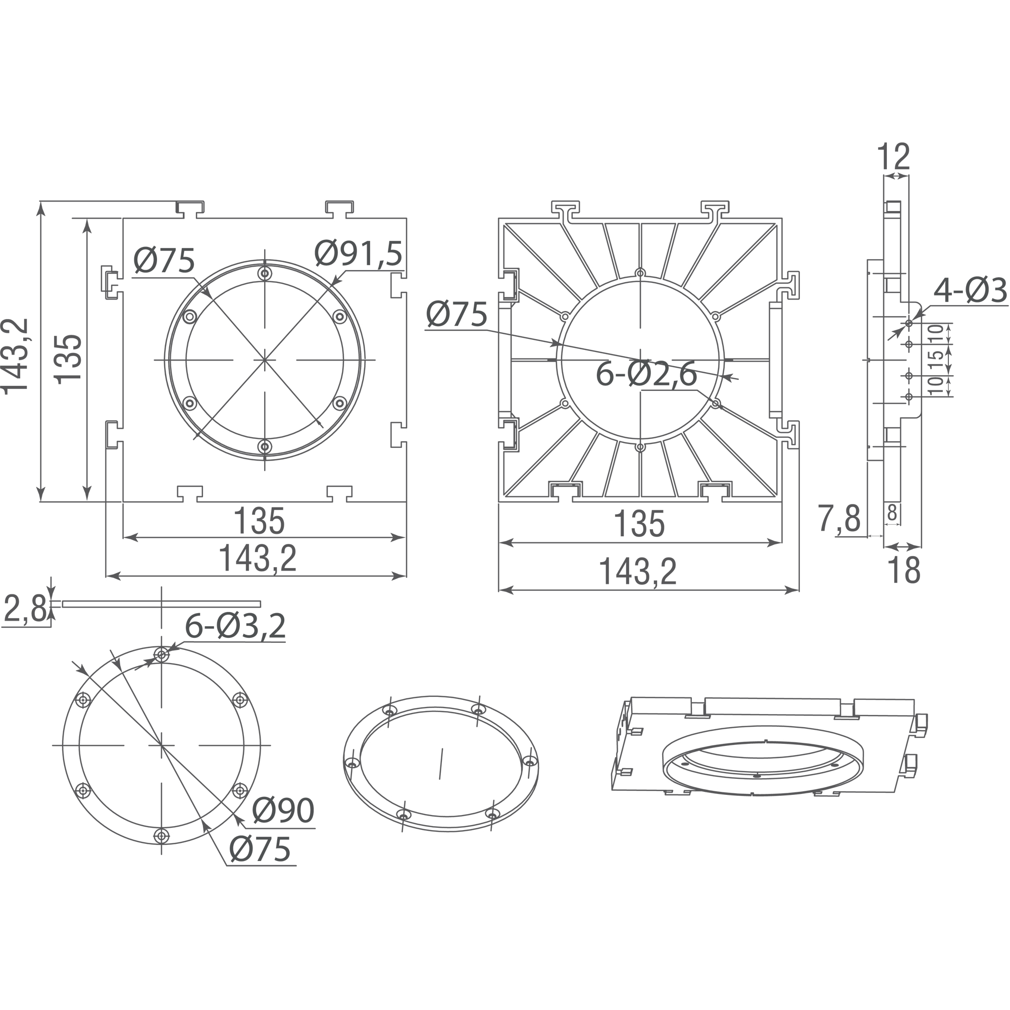 Donel Закладная панель для натяжного потолока под светильник D90мм внешний размер: 143.2*143.2*25.5